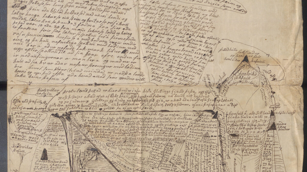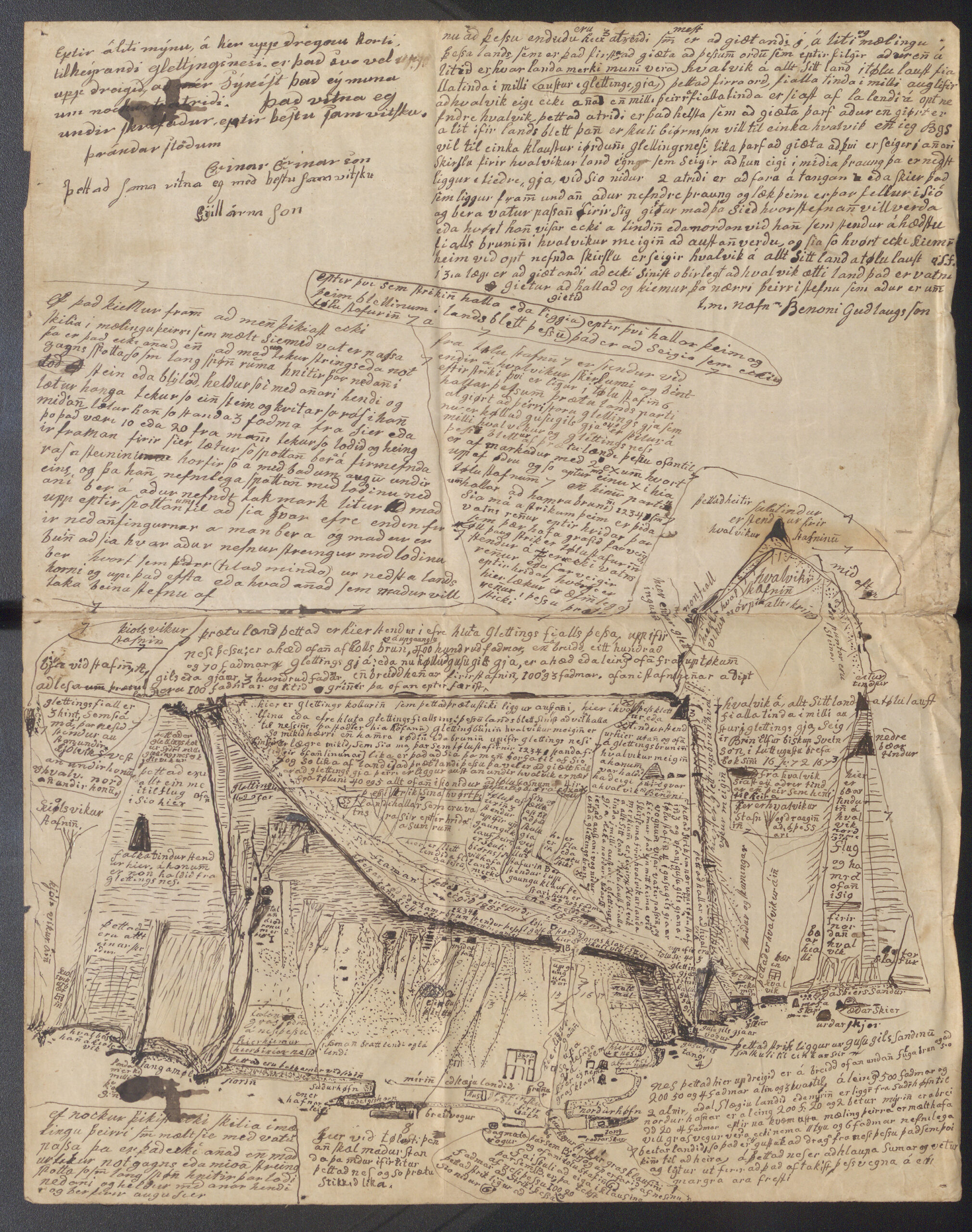 En hver var maðurinn á bak við uppdráttinn? Benóní Guðlaugsson fæddist í Fossgerði í Eiðaþinghá rétt norður af Egilsstöðum, að öllum líkindum árið 1802, og var af fátæku fólki kominn. Móðir hans Elín var Tómasdóttir og eru sumir sem telja að faðir hennar hafi verið þjóðsagnapersónan Galdra-Tómi Guðmundsson sem vikið var úr skóla fyrir kukl en aðrir segja Tómas Hallsson. Þær litlu heimildir sem til eru um fyrstu æviár Benónís eru einnig nokkuð þjóðsagnakenndar, talið er að hann hafi alist upp með móður sinni og var hún sögð hafa borið drenginn í poka og því hefði hann orðið krypplingur. Í Ættum Austfirðinga er Benóní sagður „holgóma, sérvitur og einkennilegur, allvel greindur“. Þá er hann sagður hafa verið hugvitsmaður, dulfróður og eitthvað kukllærður. Í samtímaheimildum frá fullorðinsárum hans er Benóní jafnan sagður fátækur eða öreigi. Það er sýnilegt af þeim bréfum sem eftir hann liggja að hann hefur verið vel skrifandi og upplýstur þó hann hafi ekki hlotið neina formlega menntun. Benóní átti fyrst Ólöfu Magnúsdóttur og byggðu þau í Hvalvík sem hafði þá legið í eyði frá því í upphafi 18. aldar. Þau munu hafa flutt þangað árið 1831 og var Ólöf þá vanfær af tvíburum. Magnús Guðmundsson frá Kjólsvík, barna-barnabarn þeirra skýrði frá því að þau hafi flutt þangað áður en byggt var og gert sér bráðabirgðaskýli í graslaut sem þau tjölduðu yfir með bátssegli og notuðu mastur til að halda seglinu uppi. Í þessu afdrepi ól hún tvíbura, 25. júní, dreng og stúlku. Drengurinn, sem fékk nafnið Jóhann Magnús, lifði einungis í 5 daga en stúlkan, sem skírð var því sérstæða nafni Brandþrúður (sú eina sem skírð hefur verið þessu nafni), átti eftir að eiga langa og merkilega ævi en það er önnur saga. Vorið 1841, eftir 10 ár eða svo í Hvalvík, flutti fjölskyldan frá Hvalvík á Glettinganes og hefur Hvalvík legið í eyði síðan þá. Þau hjónin eignuðust tvö börn til viðbótar, Magnús og Magnús (yngri). Árið 1849 dó Ólöf kona Benónís úr taksótt og tekur hann síðar saman við bústýru sína Guðrúnu Sigurðardóttur og eignast með henni tvo syni, þá Sigurlaug og Jóhann sem báðir komust til aldurs. Í prestþjónustubók má sjá að Benóní og Guðrún hafa ætlað sér að giftast árið 1856 en þó eru engir svaramenn skráðir. Svæðið sem Benóní og fjölskylda hans bjó á er hluti af svokölluðum Víkum á milli Borgarfjarðar eystri og Loðmundarfjarðar og er þar stórbrotið landslag. Byggð í Víkunum lagðist af um miðja 20. öld. Glettinganes er láglent lítið nes milli Kjólsvíkur og Hvalvíkur norðan fjallsins Glettings og var þar á árum áður afskekktasti bærinn í Borgarfjarðarhreppi. Útræði var mikið frá nesinu fyrrum, því skammt er þaðan til gjöfulla fiskimiða. Norðan til á nesinu er nokkuð góð lending, þótt brimasamt sé. Eftir 10 ára búsetu fjölskyldunnar á Glettinganesi verður breyting á í nágrannabænum Brúnavík og er þar sestur að bóndinn Skúli Björnsson með fjölskyldu sína. Hvenær landaþrætan milli Benónís og Skúla hófst er ekki ljóst en fjórum árum síðar, árið 1855, er þrætan um landið á milli Glettinganess og Brúnavíkur líkast til í hámarki. Ágreiningurinn stóð um landamerki og ljóst að Skúli seilist lengra en fyrri ábúendur í Brúnavík. Hans hlið og sjónarhorn í þessari deilu hefur hins vegar ekki varðveist. Þrætan hefur að öllum líkindum snúist um afnot af beitarlandi og mögulega reka en Glettinganes er lítið og óhentugt til beitar. Þau skjöl sem eru varðveitt í skjalasafni Skriðuklaustursumboðs, uppdrættirnir og vitnisburðirnir sem á eftir koma, benda til þess að mikið hafi verið í húfi fyrir Benóní og fjölskyldu hans sem sáu ekki fram á að geta haldið áfram búsetu á Glettinganesi án afnota af þrætulandinu.