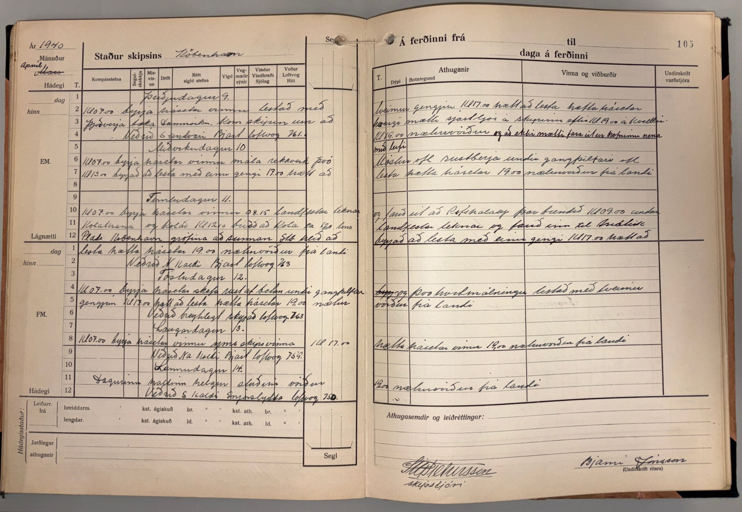 Kl. 07.00 byrja hásetar vinnu, lestað með tveimur gengjum. Kl. 17.00 hætt að lesta, hætta hásetar. Þjóðverjar taka Danmörku. Kom skipun um að hvergi mætti sjást ljós í skipinu eftir kl. 19.00 á kveldin og að ekki mætti fara út úr höfninni nema með leyfi. Veðrið s. andvari. Bjart loftvog 761. Kl. 19.00 næturvörður.“