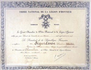Á meðal skjala í afhendingu 2025-244, sem afhent var á Þjóðskjalasafn Íslands nýlega, er að finna ramma, klæddan rauðu flaueli, utan um tvo peninga og heiðursorðu. Annar peningurinn ber mynd af franska vísindamanninum og lækninum Dr. Jean Baptiste Charcot en hinn er heiðurspeningur úr franska siglingafélaginu sem merktur er Þórði Sigurðssyni. Í miðju rammans er svo heiðursorðan Légion d’honneur, fimmarma stjarna skreytt grænum lárviðarkrans. En hvernig rataði þessi franska heiðursorða á íslenskt safn?
