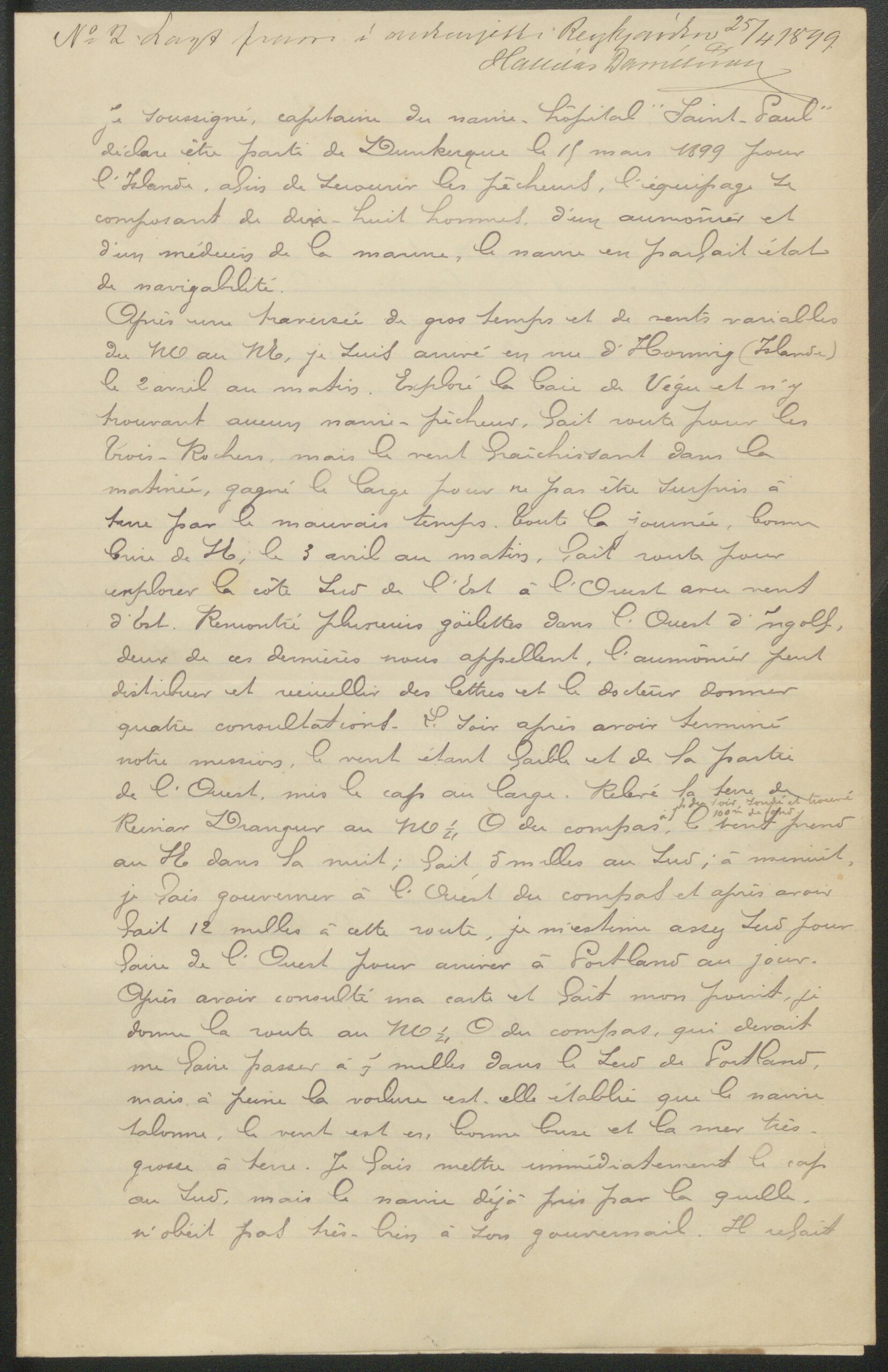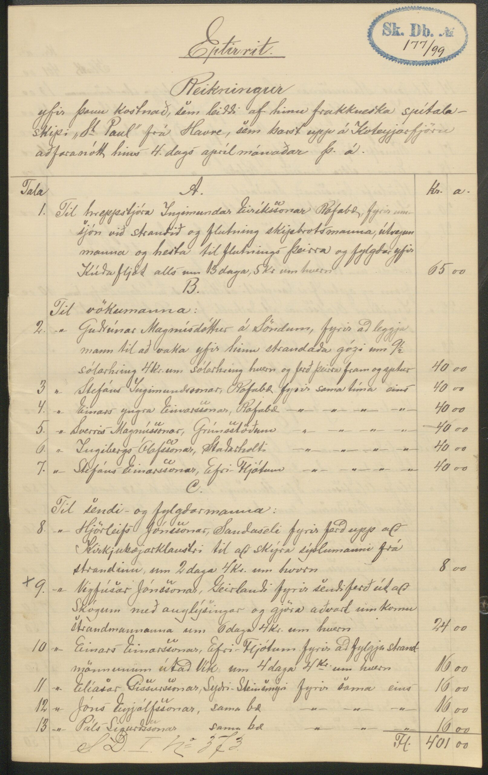 ÞÍ. Suðuramt. BA/108, örk 3. Fylgiskjöl með dagbók I, nr. 373. Strand frakkneska spítalaskipsins St. Paul frá Harve. Reikningur og greinargerð sýslumanns, 12. júní 1899; Ingimundar Eiríkssonar hreppstjóra, 4. maí 1899; séra Gísla Jónssonar, 5. maí 1899.