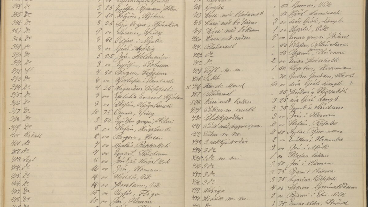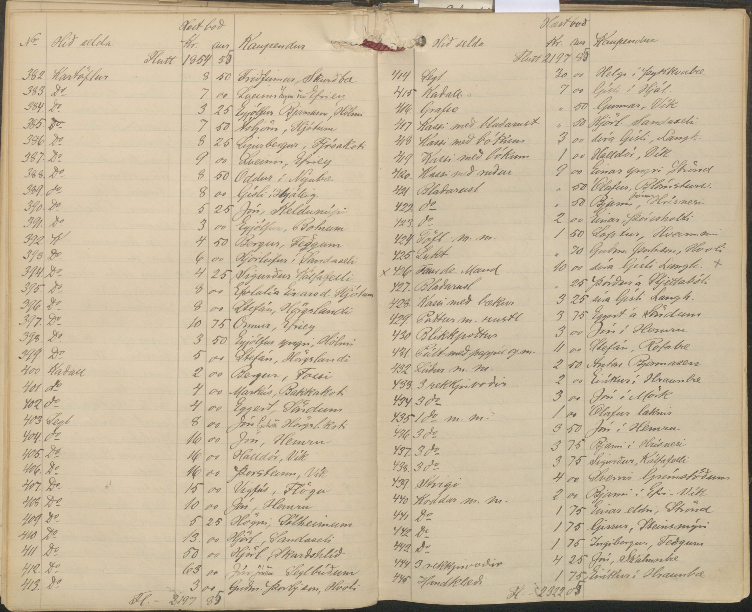 Uppboðið stóð yfir samfellt í tvo daga, frá morgni til kvölds dagana 12.–13. apríl. Í uppboðsbókina var allt skráð, hver einstakur hlutur sem boðinn var upp, og fram kemur hver keypti hvað og fyrir hve mikið. Þetta voru alls 774 boð sem ná yfir 26 blaðsíður í uppboðsbók sýslumanns. Það eru sennilega vel yfir helmingi fleiri boð en í venjulegu strandi.