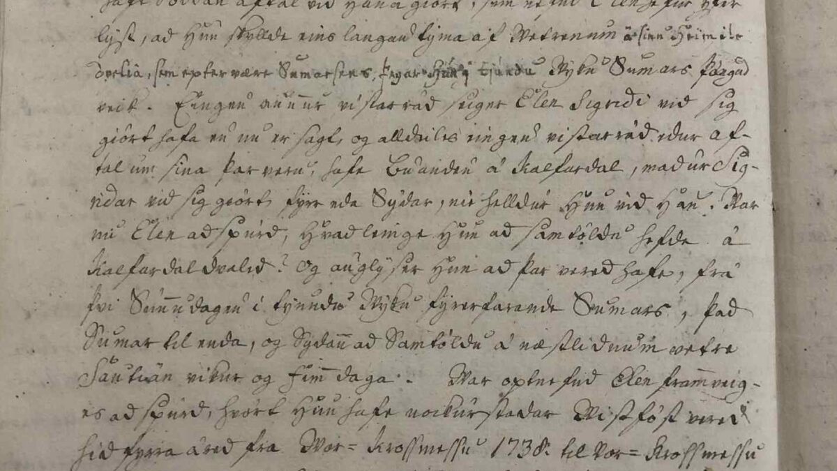 Var oftnefnd Elín framvegis aðspurð, hvört hún hafi nokkurs staðar vistföst verið hið fyrra árið frá vorkrossmessu 1738 til vorkrossmessu 1739. Svarar hún „nei“, heldur segist hún það ár hafa bjargað sér á ýmsum bæjum eftir því sem sérhver hafi lofað sér að vera. Framvegis með því þessi Elín kom í þetta hérað, svo að hún framvísaði ekkert attest eður skilríki um hegðan sína, var hún nú aðspurð fyrir réttinum, hvört hún væri í öngvum sökum í Hegranessýslu [=Skagafjarðarsýslu] eða annars staðar, hvörju hún neitar. Einasta segist hún hafa brotleg orðið þar í Skagafirði að barneignum, tveimur í frillulífi og þriðja í hórdómi, hvar fyrir hún segist kvittun fengið hafa af andlegu og veraldlegu yfirvaldi. Því næst, aðspurð um heilsufar hennar og vinnubrögð, framber að hún sé sjóndöpur, svo hún geti hvorki hey rakað né sætt að skaðlausu, ei heldur vefnað gjört, hvað hún og aldrei lært hafi, né heldur pening eður hesta sókt eður tún vaktað svo óhult sé, ei heldur nokkurn hlut saumað að gagni.
